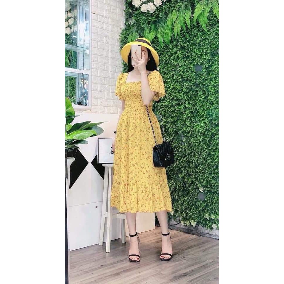 Đầm Maxi Hoa Tay Bèo Bo Nhún Ngực Cổ Vuông Chất Voan Kèm Hình Thật